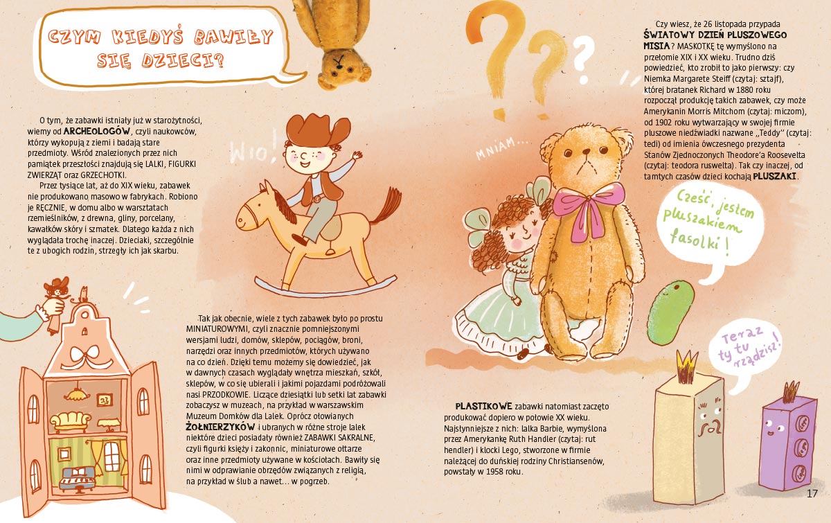 Czy wiesz, kto wymyślił Dzień Dziecka? W co się ubierały hiszpańskie infantki (czyli królewny)? Czym kiedyś bawiły się dzieci? Co je mały mieszkaniec Arktyki? Czy dzieci mogą zarabiać pieniądze? Czy zawsze musiały chodzić do szkoły? Kiedy królem Polski była dziewczynka? Co to znaczy „wylać dziecko z kąpielą”? Kto był największym dziecięcym geniuszem muzycznym? Poznaj odpowiedzi na te i wiele innych pytań z niezwykłej książki o dzieciach. Poza ciekawostkami znajdziesz tu dużo interaktywnych zadań. Zaprojektuj razem z nami własne emotikony, zostań encyklopedystą, napisz list do polityków o tym, co dorośli powinni robić, żeby dzieci były bezpieczne i szczęśliwe, załóż z przyjaciółmi bank czasu, narysuj własny łapacz snów, włącz się do akcji Wielkie Ogólnoświatowe Liczenie Gwiazd!
