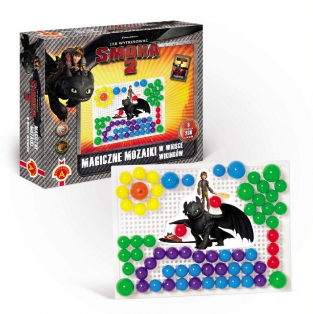 Magiczne mozaiki 230 elementów. Produkty licencjonowane Drem Works, JAK WYTRESOWAĆ SMOKA 2. MAGICZNE MOZAIKI 230 SMOKI 2 W WIOSCE WIKINGÓW to kreatywna zabawa dla dzieci, młodzieży i dorosłych.Do Waszej dyspozycji oddana zostaje plansza z mnóstwem otworów, w których należy umieścić różnej wielkości kolorowe elementy, by stworzyć rozmaite wzory i obrazy. Istnieje niemal nieskończona ilość kombinacji, a po wykonaniu ilustracji wystarczy,że wyjmiecie elementy i możecie zacząć od nowa.Do zestawu dołączony jest album zawierający ponad 100 inspiracji, Zabawa ćwiczy kreatywność i wyobraźnię. Zestaw zawiera 300 kołeczków o śr. 15 mm 42 szt, 23 mm 150 szt, 30 mm 28 szt.
