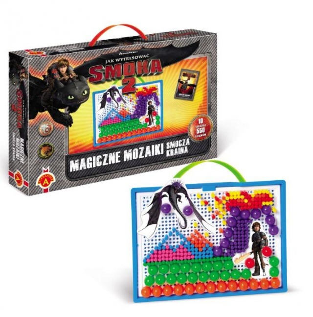 Jak Wytresować Smoka 2! Magiczne mozaiki 550 elementów, produkt licencjonowany Drem Works. Układaj kształty z kolorowych elementów. W zestawie praktyczna walizka z uchwytem. ""MAGICZNE MOZAIKI 550 SMOKI 2 SMOCZA KRAINA"" to kreatywna zabawa dla dzieci, młodzieży i dorosłych. Do Waszej dyspozycji oddana zostaje plansza z mnóstwem otworów, w których należy umieścić różnej wielkości kolorowe elementy, by stworzyć rozmaite wzory i obrazy. Istnieje niemal nieskończona ilość kombinacji, a po wykonaniu ilustracji wystarczy,że wyjmiecie elementy i możecie zacząć od nowa. Zabawa ćwiczy kreatywność i wyobraźnię. Zestaw zawiera 550 kołeczków.