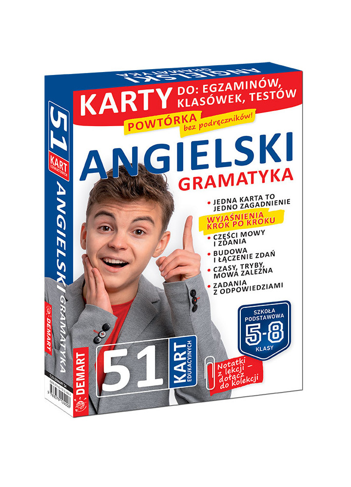 Karty do gramatyki języka angielskiego to pomoc edukacyjna do używania w domu i w szkole, przewidziana dla uczniów klas V-VIII szkoły podstawowej. Pakiet 51 dwustronnych, kolorowych, starannie graficznie opracowanych kart edukacyjnych obejmuje wszystkie ważne tematy gramatyczne uwzględnione w podstawie programowej, m.in. czasy, tryby, mowę zależną, części mowy i zdania oraz budowę i łączenie zdań.