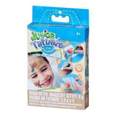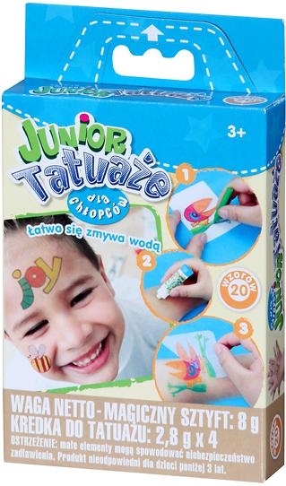 Zestaw, dzięki któremu każdy chłopiec może sam stworzyć sobie zmywalny tatuaż. Wybór formy i kształtów zależy od Twoich pomysłów. Wykonaj odpowiedni tatuaż i zamień się np. w Indianina.Tatuaż wykonuje się bardzo prosto - wystarczy pomalować dołączony rysunek kredkami przenieść go na kalkę i za pomocą magicznego sztyftu przykleić go np. do ręki lub nogi. Zmywalne tatuaże są bezpieczne, do ich usunięcia wystarczy woda z mydłem. ZAWARTOŚĆ: 4 kredki do tatuażu - 2,8g każda, magiczny sztyft - 8g, 20 wzorów z motywami dla chłopców, 20 kalek kreślarskich, gąbka.