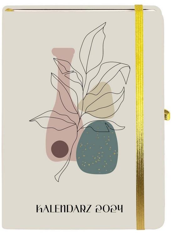 Kolekcja: Linear Format: A5 Wymiary okładki: 210x144 mm Układ: tydzień na stronie Ilość stron: 144 Oprawa: twarda Materiał: papier Gramatura papieru: 80g Kolor papieru: chamoise Dodatki: plan roku 2024, ważne wydarzenia, skorowidz adresowy, notatki Pionowa gumka zamykająca: złota Wstążka: złota Gumka na długopis: tak, złota Zaokrąglone rogi: tak Wyklejka: chamoise Koperta: tak
