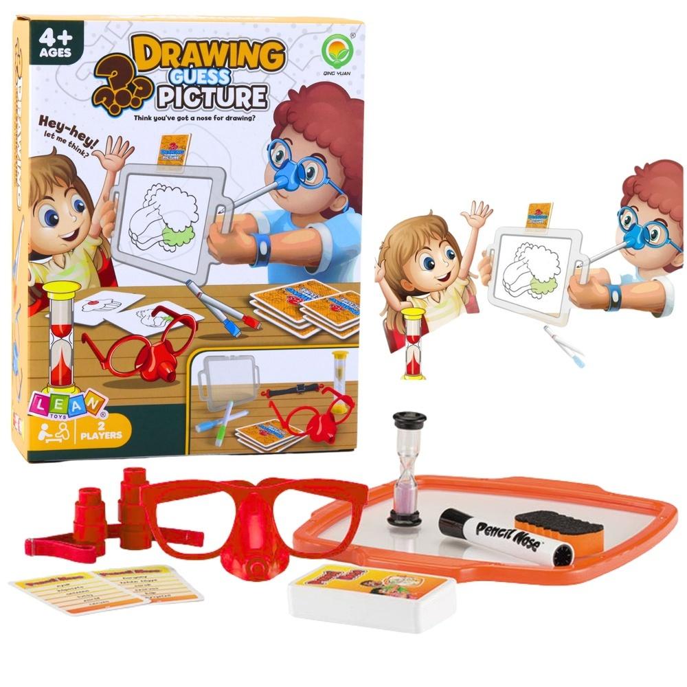Opis produktuZasady bezpieczeństwaGRA NARYSUJ I ZGADNIJ OBRAZEK - MALOWANIE NOSEM Narysuj i Zgadnij Obrazek to przezabawna i kreatywna gra rodzinna, która pozwala graczom rysować nosem! Dzięki specjalnym okularom z uchwytem na marker, rysowanie staje się nie lada wyzwaniem i źródłem ogromnej dawki śmiechu. Gra łączy w sobie elementy kalamburów, rysowania i rywalizacji drużynowej - idealna na imprezy, spotkania rodzinne czy wspólną zabawę z dziećmi. Zadaniem gracza jest narysowanie hasła z karty przy pomocy specjalnych okularów - marker zamocowany w ramce służy jako "nos", którym malujemy na przezroczystej tablicy. Pozostali gracze muszą jak najszybciej odgadnąć, co przedstawia rysunek. Czas ogranicza klepsydra, więc liczy się refleks, wyobraźnia i współpraca. Gra została zaprojektowana z myślą o dzieciach od 4 roku życia, jednak bawi zarówno najmłodszych, jak i dorosłych. Zestaw zawiera 54 karty z hasłami i wszystkie akcesoria potrzebne do gry. Dodatkowym atutem jest możliwość tworzenia własnych haseł, dzięki czemu zabawa nigdy się nie nudzi! SPECYFIKACJA: Rodzaj gry: kreatywna gra drużynowa - rysowanie nosem Liczba graczy: 2 lub więcej (gra drużynowa) Tryb gry: na hasła z kart lub wymyślone przez graczy Czas jednej rundy: odliczany przez klepsydrę Cel gry: narysować obrazek nosem i odgadnąć jak najwięcej haseł Wymiary opakowania: 27 x 21 x 6,5 cm Materiał: tworzywo sztuczne, plastik, papier ZAWARTOŚĆ ZESTAWU: 2 x okulary z miejscem na marker 2 x marker (niebieski i zielony) z końcówką do ścierania 1 x przezroczysta tablica do rysowania 54 x karty z hasłami 1 x klepsydra 2 x opaski na rękę x