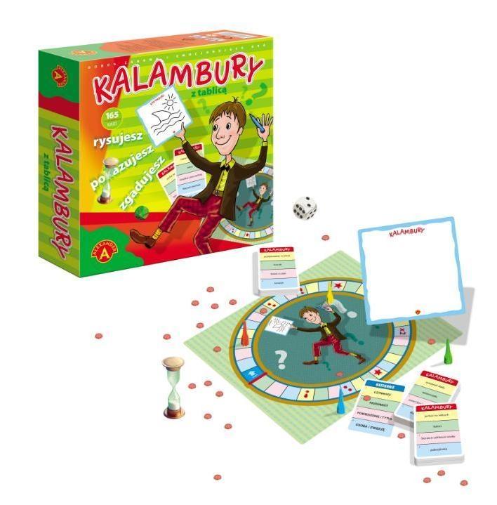 Kalambury z tablicą"" to gra zespołowa, w której należy jak najszybciej zgadnąć (przedstawione za pomocą rysunku na tablicy) hasło wybrane losowo z karty. Przebieg gry tworzy niezwykłą, pełną humoru i wielkich emocji atmosferę rodzinnej zabawy. W tej grze zwyciężają ci, którzy dzięki swej wyobraźni i inteligencji potrafią przedstawić jak najsugestywniej i najsprawniej wylosowane hasło, a także jak najszybciej je odgadnąć. Zawartość opakowania: 163 dwustronne karty haseł, 2 karty kategorii, plansza, 4 pionki, kostka do gry, 80 żetonów, tablica, pisak, gąbka, klepsydra, instrukcja.