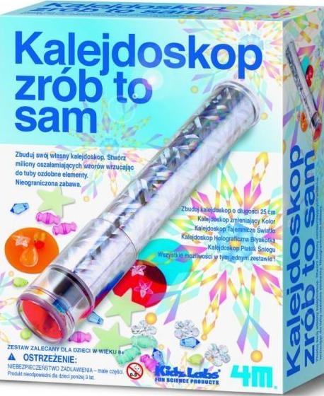 Niezwykłe wrażenia, spełnienie marzenia! Czy wiesz, że kalejdoskop wynaleziono na początku XVIII wieku? Słowo ,,kalejdoskop"" to połączenie greckich słów: ,,kalos"", ,,eidos"" i ,,scopos"", które razem tworzą: ,,oglądanie pięknych form"". Teraz Ty też możesz podziwiać ,,piękne formy"". Zbuduj długi na 25 cm kalejdoskop, którego komora posiada specjalnie zaprojektowaną, zdejmowaną pokrywkę. Wybierz odpowiednie elementy i stwórz jeden z poniższych kalejdoskopów: - Kalejdoskop Tęczowy, - Kalejdoskop Tajemnicze Światło, - Kalejdoskop Holograficzny lub - Kalejdoskop Płatek Śniegu. Możesz wrzucić do komory swoje własne części i stworzyć niepowtarzalny kalejdoskop! Tak wiele różnych możliwości w tym jednym zestawie! Czeka Cię nieograniczona zabawa! ZAWARTOŚĆ: stożek papierowy, folia holograficzna, stała komora ze zdejmowaną pokrywką, 3 bezpieczne lusterka, 4 torebki ozdób (świecące w ciemności gwiazdki, barwne koraliki, cekiny, przezroczyste koraliki), 3 kolorowe filtry, wizjer, pasek kartonowy, dwustronna taśma klejąca, szczegółowe instrukcje zawierające ciekawostki i pomysły na zbudowanie kalejdoskopu.