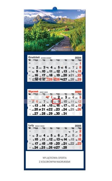 Opis produktuZasady bezpieczeństwaKALENDARZ TRÓJDZIELNY NA 2025 ROK WYMIAR CAŁKOWITY KALENDARZA: 32 x 85,5cm GŁÓWKA KALENDARZA: Zdjęcie uszlachetniane folią błysk, z efektem wypukłości. KALENDARIUM: wym. 28,5 x 14 cm, trójjęzyczne (PL, GB, D), z numeracją tygodni i imieninami jest przytrzymywane przez kartonowe wypustki, które zapobiegają jego odstawaniu od plecków kalendarza. WYKOŃCZENIE: kartonowa zawieszka, pasek z czerwonym przesuwanym okienkiem, miejsce na notatki. x