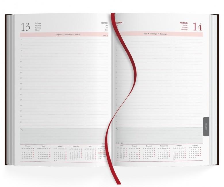w języku polskim, angielskim, niemieckim, hiszpańskim, numeracja dni i tygodni, potrójne imieniny, perforacja narożników Część informacyjna:
