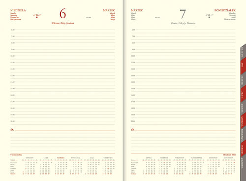 Kalendarz A4 dzienny, papier kremowy 70g/m2 z registrami. format bloku 200x294mm, 416 stron, druk szaro-bordowy, rozbudowana część informacyjna, skorowidz teleadresowy, kalendarium PL, GB, D, F, RUS, kapitałka i tasiemka żółte. Kalendarz Cross z gumką w kolorze okładki, na gumce ażurowa data chromowana.