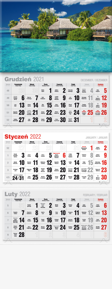 Kalendarz Trójdzielny Lux jest produktem dedykowanym niewielkim firmom pod kalendariami oferuje przestrzeń na personalizowany przekaz reklamowy wielkości 310x75 mm. Kalendaria zawierają oznaczenia miesięcy i dni tygodnia w trzech językach (PL, EN, DE) oraz imieniny i typowe święta.