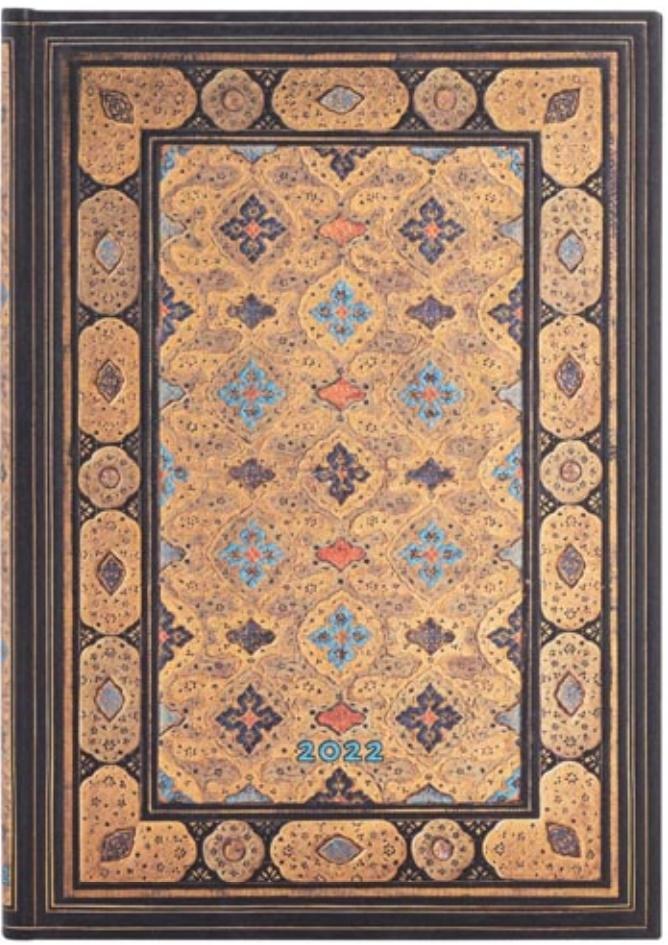 Opis produktuZasady bezpieczeństwaKalendarz na rok 2022, 12-miesięczny MIDI z kolekcji ekskluzywnej marki Paperblanks. Elegancka okładka inspirowana filigranowym wzorem z ręcznie wykonanymi motywami nawiązuje do stylu Islamskiej Złotej Ery. W środku znajdziemy miejsce na codzienne wpisy, notatki, planery, dwie satynowe wstążki, mini kalendarze, międzynarodowe numery kierunkowe, miejsce do wpisania swoich ważnych numerów, oznaczone wybrane święta międzynarodowe i wiele innych przydatnych informacji. Format Midi typu Horizontal - rozplanowany cały tydzień na 2 stronach. Opisy są w języku angielskim. Kalendarz posiada 160 zszywanych stron, format 130x180mm, gramatura 100 gsm. Oprawa twarda. Na końcu po wewnętrznej stronie okładki jest koperta na luźne notatki lub wizytówki. Zamknięcie na gumkę. x