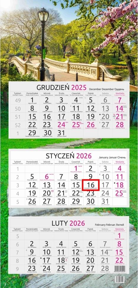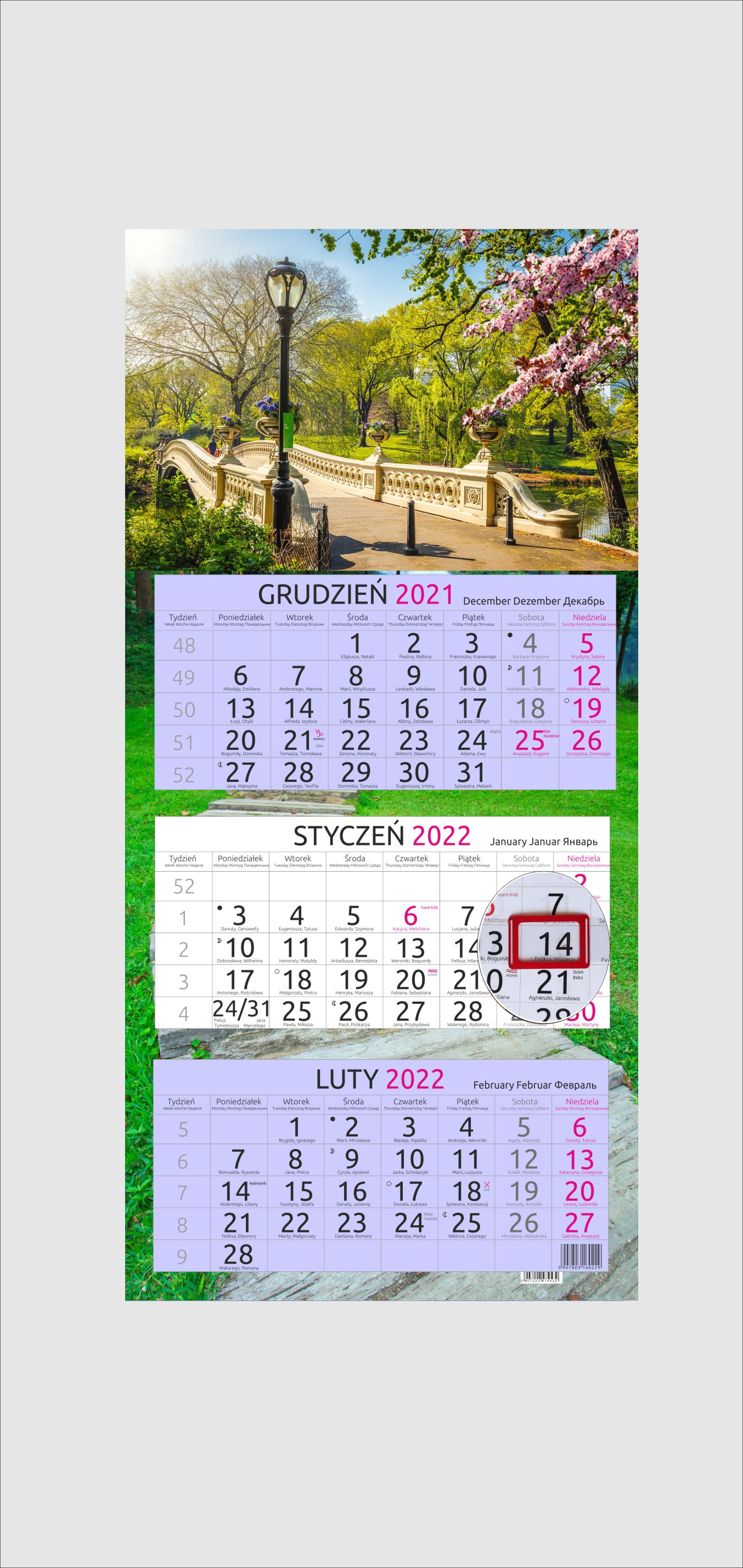 Wymiary 32 x 67 cm Kalendarium czterojęzyczne kalendarium (PL, GB, D, RUS) z numeracją tygodni i imieninami, bieżący miesiąc wyróżniony kolorystycznie Wykończenie pasek z czerwonym okienkiem, dziurka do zawieszenia Kolorystyka druk czarno - czerwony Ilość stron 3 osobne kalendaria po 12 stron Opcja koperta kartonowa, nadruk na kopercie Główka płaska, uszlachetnienie lakier UV Plecki karton 315g