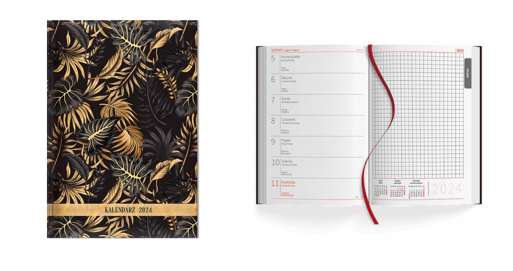 Opis produktuZasady bezpieczeństwa- Format: A5 - 13,5 × 20 cm, 144 strony - Układ: 1 tydzień na stronie, druga strona notes - Druk, papier: 2 kolory, papier 80 g/m2 w kolorze białym -Kalendarium: w języku polskim, angielskim, niemieckim, numeracja tygodni, podwójne imieniny -Oprawa: twarda, drukowana zmiękczona gąbką z folią błyszczącą -Część informacyjna: plan roczny, miesięczny, skorowidz alfabetyczny, strefy czasowe i inne x