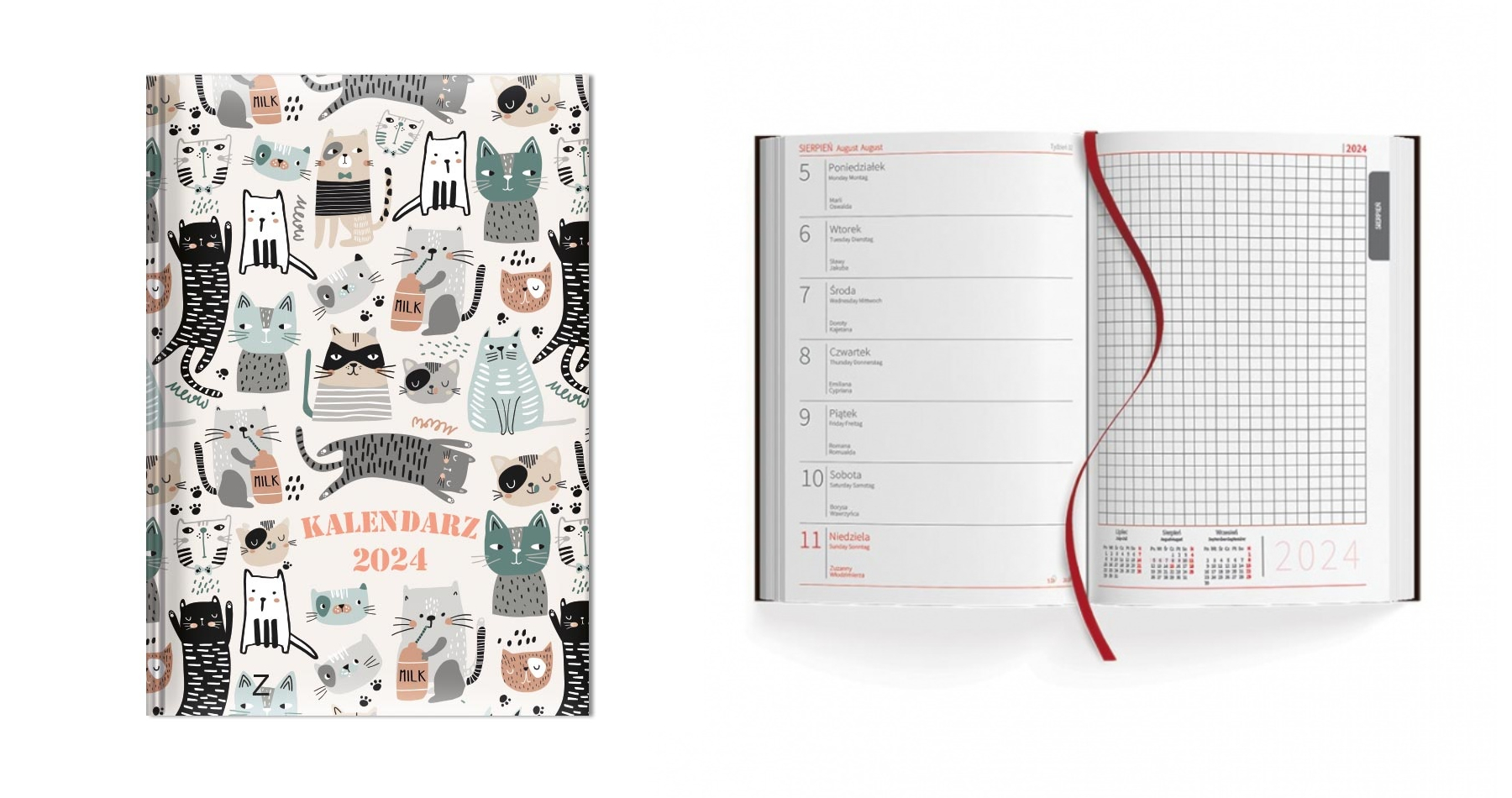 Opis produktuZasady bezpieczeństwa- Format: A5 - 13,5 × 20 cm, 144 strony - Układ: 1 tydzień na stronie, druga strona notes - Druk, papier: 2 kolory, papier 80 g/m2 w kolorze białym -Kalendarium: w języku polskim, angielskim, niemieckim, numeracja tygodni, podwójne imieniny -Oprawa: twarda, drukowana zmiękczona gąbką z folią błyszczącą -Część informacyjna: plan roczny, miesięczny, skorowidz alfabetyczny, strefy czasowe i inne x