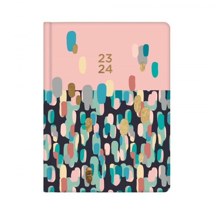 kalendarz książkowy 2023/2024, 18 miesięcy: lipiec 2023 - grudzień 2024, format: B6, wymiary: 12,5 x 17 x 1,5 cm, układ: tygodniowy, wewnątrz: wstążka, plan roku 2022, notatnik, adresownik, linijka, kalendarium dodatkowe na 2022-2023, gramatura: 120 g/m2, oprawa: twarda, gąbkowana