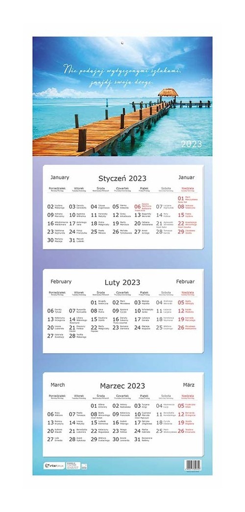 Kalendarz trójdzielny o wymiarach 34x82,5 cm. Zrywane kartki kalendarium. Opaska z przesuwanym okienkiem. 3 odrębne kalendaria po 12 kartek. Zaznaczone imieniny, najważniejsze daty i święta. Ciekawa grafika na główce kalendarza.