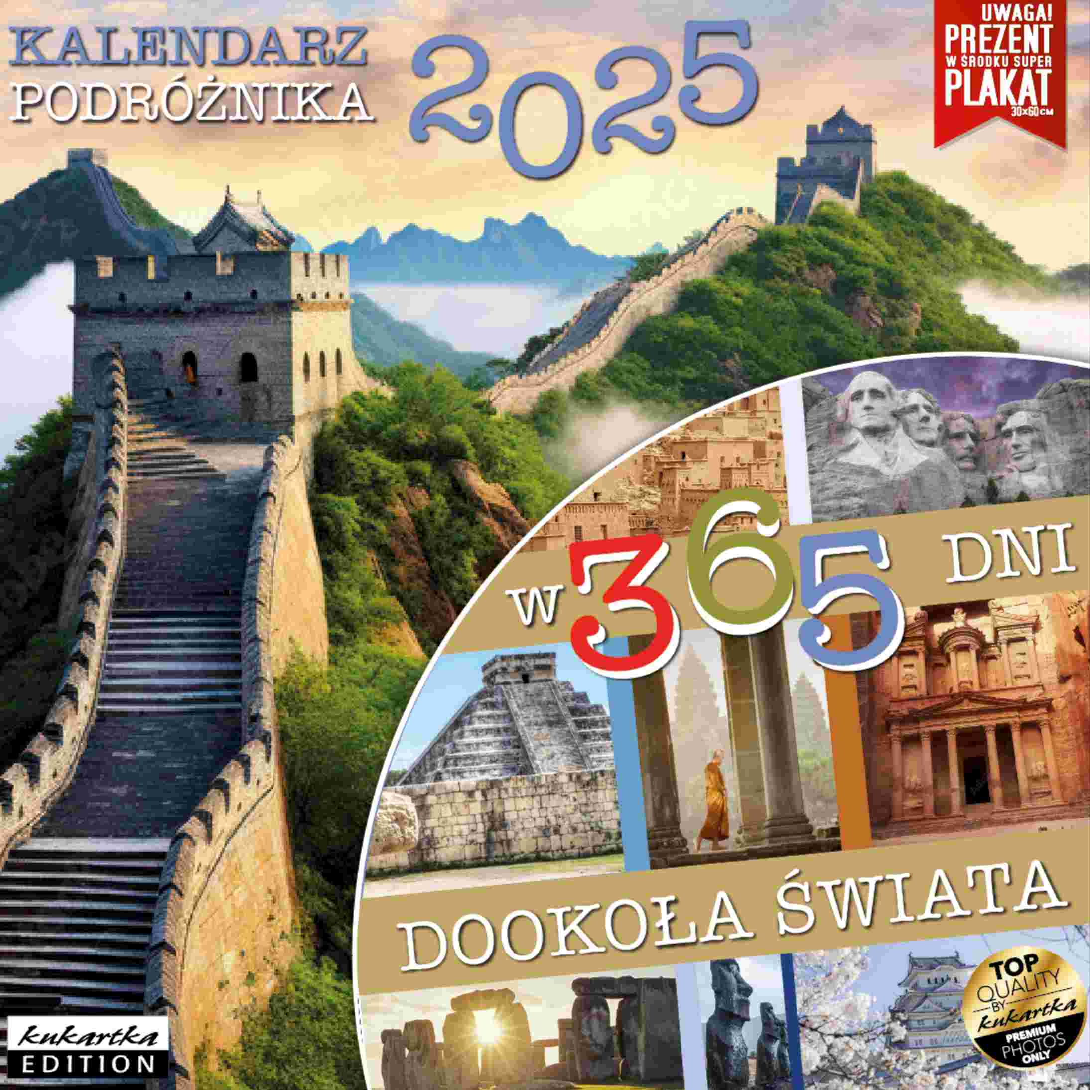 Opis produktuZasady bezpieczeństwaKalendarz 2025 365 dni dookoła świata Kwadratowy kalendarz ścienny na rok 2025 z serii ""365 dni dookoła świata"". Każdy miesiąc cieszy pięknym zdjęciem, które będzie wspaniałą ozdobą Waszego domu oraz inspiracją dla podróżników. Kalendarz po rozłożeniu ma wymiary 30x60 cm - górny kwadrat wypełnia zdjęcie, a dolny kalendarium. PREZENT: w środku kalendarza znajdziecie plakat o wielkości 30x 60 cm! Specyfikacja: Wielkość: 30 x 30 cm (po rozłożeniu 30 x 60 cm) Gratis: plakat Styl: cytaty, nowoczesny, klasyczny, zdjęciowy x