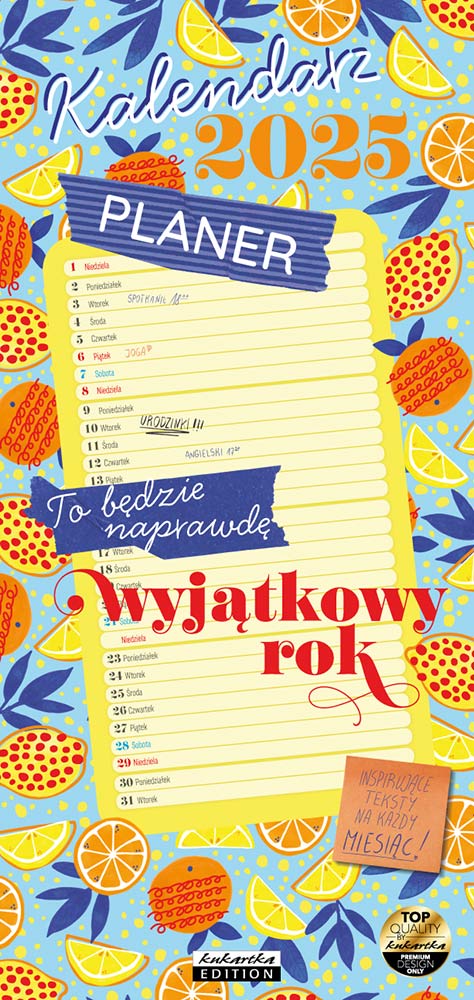 Opis produktuZasady bezpieczeństwaPlaner 2025 Trendy Podłużny kalendarz ścienny na rok 2025 ""Trendy"" Każdy miesiąc cieszy ciekawymi ilustracjami, które będą wspaniałą ozdobą Twojego domu. Planer TRENDY pozwoli być na bieżąco ze wszystkimi zajęciami - nic Cię już nie zaskoczy :) Specyfikacje: Wielkość: 21 x 45 cm Kalendarium: można po nim pisać Styl: cytaty, nowoczesny, klasyczny, zdjęciowy x
