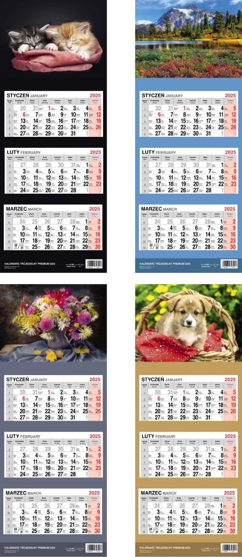 Opis produktuZasady bezpieczeństwaKalendarz Trójdzielny jest niezastąpionym narzędziem dla każdego, kto pragnie mieć swoje terminy pod pełną kontrolą. Kalendarz został starannie zaprojektowany, by oferować nie tylko pełen przegląd bieżącego miesiąca, ale również umożliwiać łatwe śledzenie poprzednich wydarzeń, dzięki prezentacji trzech miesięcy na jednej stronie - bieżącego i dwóch poprzednich (Układ kalendarium: 3 miesiące - 1 kartka). Przesuwane okienko umożliwia intuicyjne zaznaczanie i śledzenie poszczególnych dni, co czyni go wyjątkowo praktycznym w codziennym użyciu. Kalendarz jest wyposażony w wytrzymałą dziurkę, która umożliwia proste i bezpieczne zawieszenie go na ścianie, gwarantując, że będzie on zawsze pod ręką i w zasięgu wzroku. Idealnie sprawdzi się zarówno w domowym gabinecie, jak i w dynamicznym środowisku biurowym, gdzie szybki dostęp do informacji o dacie jest niezbędny. Dodatkowo, kalendarz jest opakowany w folię w celu ochrony przed uszkodzeniami podczas transportu, zapewniając, że dotrze do Ciebie w idealnym stanie. Produkt jest dostępny w formacie 310 x 790 mm, co zapewnia jego czytelność i wygodę użytkowania. MIX - wysyłka losowa - koty, psy, bukiety, krajobrazy x