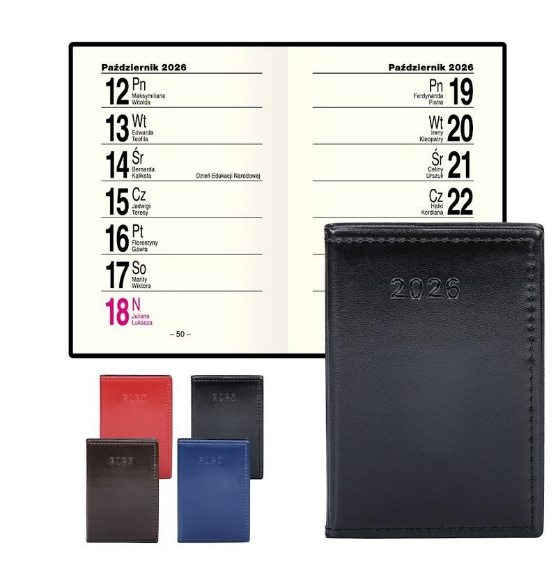 Opis produktuZasady bezpieczeństwa- Format A7 (73x107x9 mm) - Ilość stron: 80 - Oprawa: twarda skóropodobna - Układ środka: tydzień na stronie - Idealny do torebki lub kieszeni - Papier 70 g/m2 w kolorze ecru - Kalendarium: w języku polskim, angielskim i ukraińskim - Numeracja dni i tygodni, podwójne imieniny - Część informacyjna: strony na notatki, telefony kierunkowe, skorowidz alfabetyczny, daty imienin i Świąt.