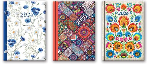 Kalendarz w układzie dziennym (1 dzień na stronie). Poręczny format B6 (blok: 11 x 16,5 cm), papier kremowy, druk szaro-bordowy, registry drukowane. Wstążka-zakładka; 336 stron; notes teleadresowy. Okleina okleina graficzna (drukowana).