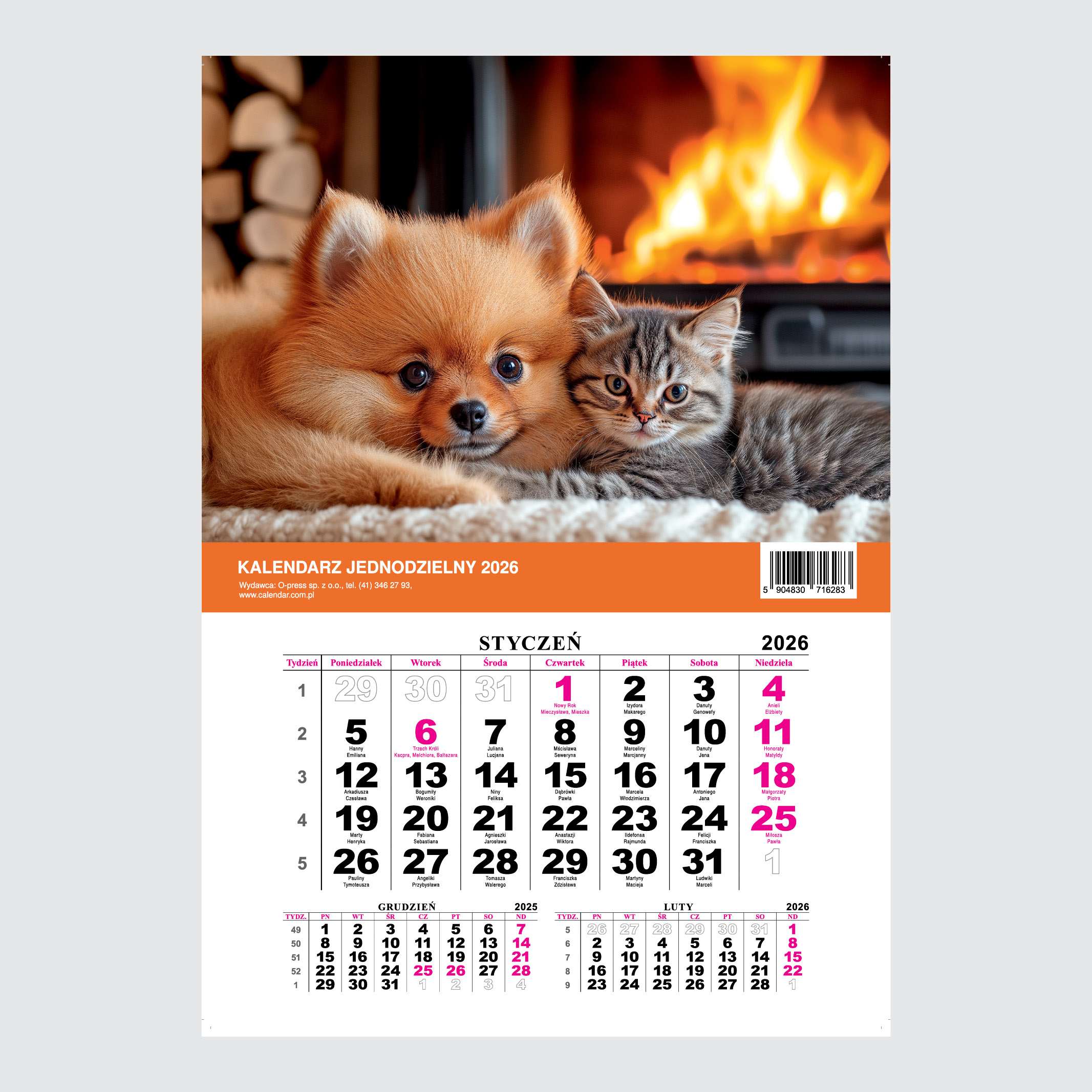 Opis produktuZasady bezpieczeństwa- Format 210x295x2 mm - Ilość stron: 12 - Oprawa: szyta - Układ kalendarium: jeden miesiąc-1 kartka - Kalendarz posiada dziurkę umożliwiającą powieszenie - Zawiera czytelne kalendarium z imieninami i świetami w języku polskim - Posiada okienko przesuwne