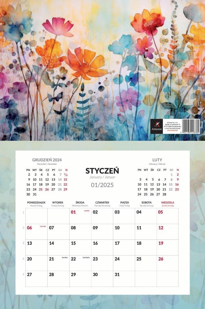 dostępny w 4 wzorach, kalendarium miesięczne + miniatury 2 miesięcy, płaska główka, rozmiar 45x30cm, eurodziurka do zawieszenia x