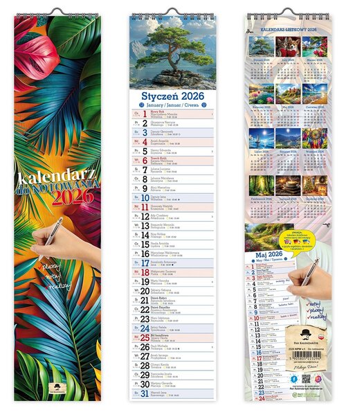 Opis produktuZasady bezpieczeństwaKalendarz 2026 ŚCIENNY PASKOWY WĄSKI drukowany jednostronnie. Format 106/470mm 12 kart + 2 okładki. Oprawa spirala z zawieszką. Duże czytelne kalendarium z miejscem na notatki . KALENDARZ DO NOTOWANIA I PLANOWANIA KAŻDEGO DNIA. Dodatkowo nazwy miesiąca i dni tygodnia w języku Ukraińskim, Angielskim i Niemieckim. Kalendarium zawiera imieniny, nazwy Świąt, czasy wschodów i zachodów Słońca oraz fazy Księżyca. DODATKOWO TYLNA OKŁADKA ZAWIERA KALENDARZ LISTKOWY DO WYCIĘCIA. https://linktr.ee/PanKalendarzyk.Resellersx