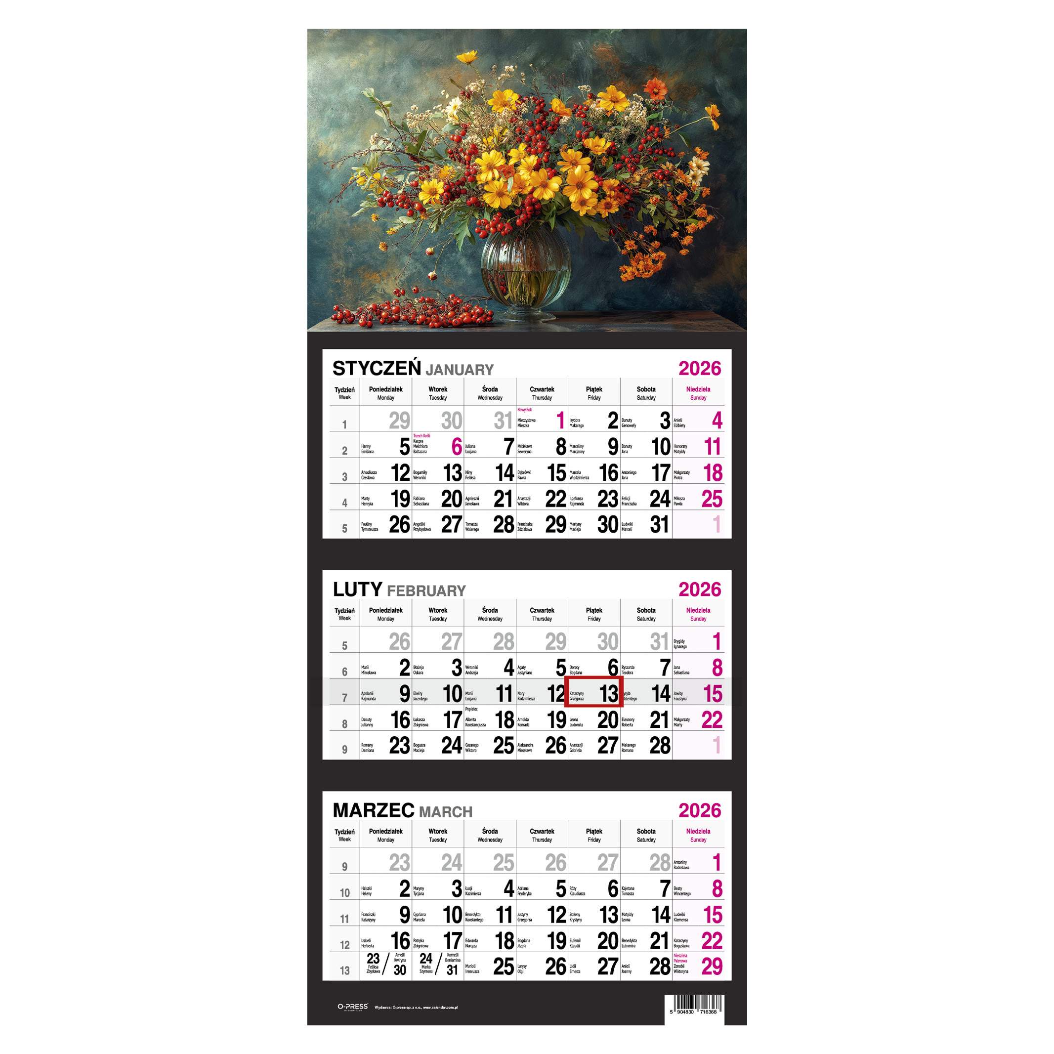 Kalendarz Trójdzielny to niezastąpione narzędzie dla każdego, kto pragnie mieć pełną kontrolę nad swoimi terminami. Zaprojektowany z myślą o funkcjonalności i estetyce, oferuje jednoczesny wgląd w trzy miesiące - bieżący oraz dwa poprzednie - co czyni go wyjątkowo pomocnym w planowaniu i analizowaniu wcześniejszych wydarzeń. Praktyczne przesuwane okienko umożliwia intuicyjne zaznaczanie aktualnego dnia, co znacząco ułatwia codzienne użytkowanie. Dzięki temu kalendarz sprawdza się zarówno w środowisku domowym, jak i biurowym, gdzie szybki dostęp do aktualnej daty jest niezbędny. Wyposażony w wytrzymałą dziurkę, kalendarz można łatwo i bezpiecznie zawiesić na ścianie, zapewniając jego widoczność oraz dostępność w każdej chwili. Format 310x790x4 mm gwarantuje czytelność kalendarium oraz komfort użytkowania. Dodatkową zaletą jest staranne opakowanie w folię ochronną, które zabezpiecza produkt przed uszkodzeniami podczas transportu, gwarantując jego nienaganny wygląd po dostarczeniu. Dostępne wzory: Palmy, Pies, Plaża, Kawa, Bukiet, Kot, Widok, Góry x