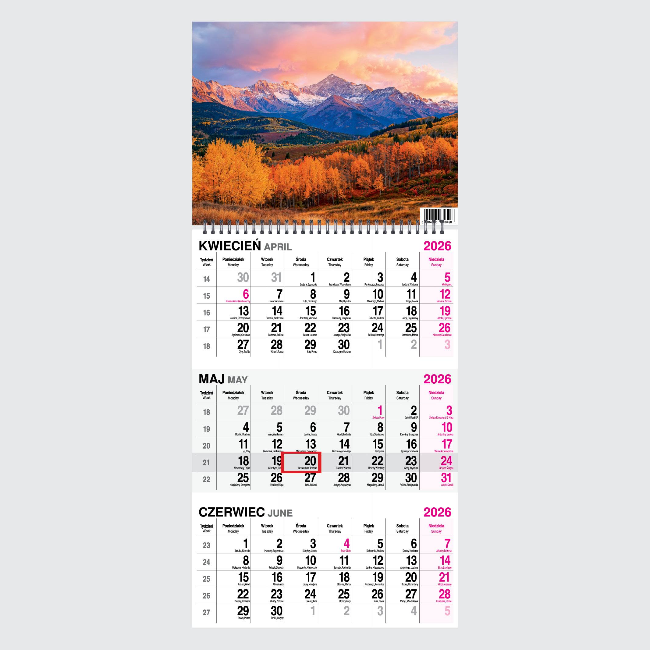 - Ilość stron: 12 - Oprawa: spirala - Układ kalendarium: 3 miesiące-1 kartka - Kalendarz posiada dziurkę umożliwiającą powieszenie - Zawiera czytelne kalendarium z imieninami i świętami w języku polskim - Posiada okienko przesuwne