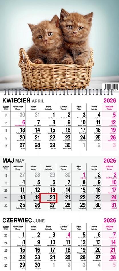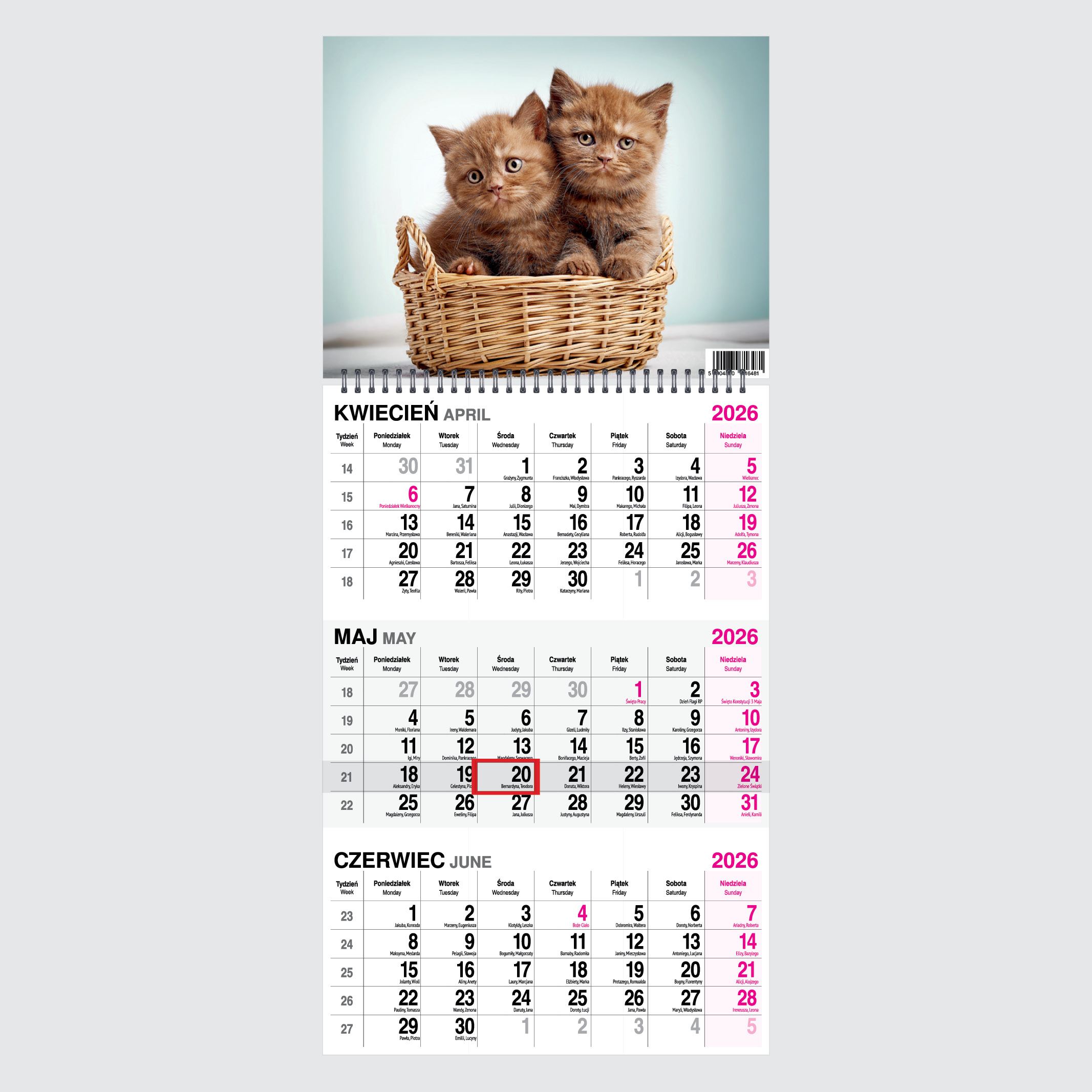 - Ilość stron: 12 - Oprawa: spirala - Układ kalendarium: 3 miesiące-1 kartka - Kalendarz posiada dziurkę umożliwiającą powieszenie - Zawiera czytelne kalendarium z imieninami i świętami w języku polskim - Posiada okienko przesuwne