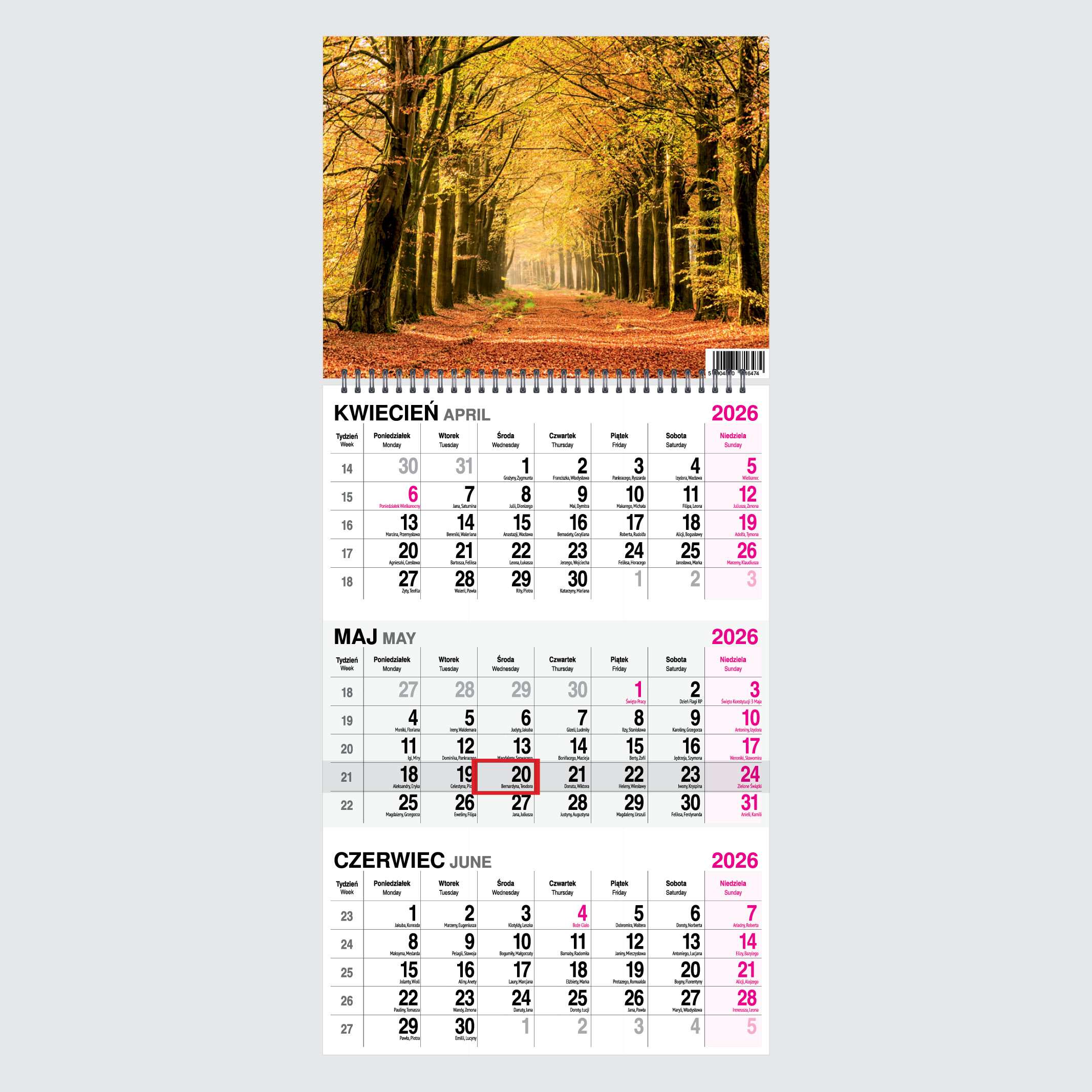 Kalendarz 2026 trójdzielny na spirali Las