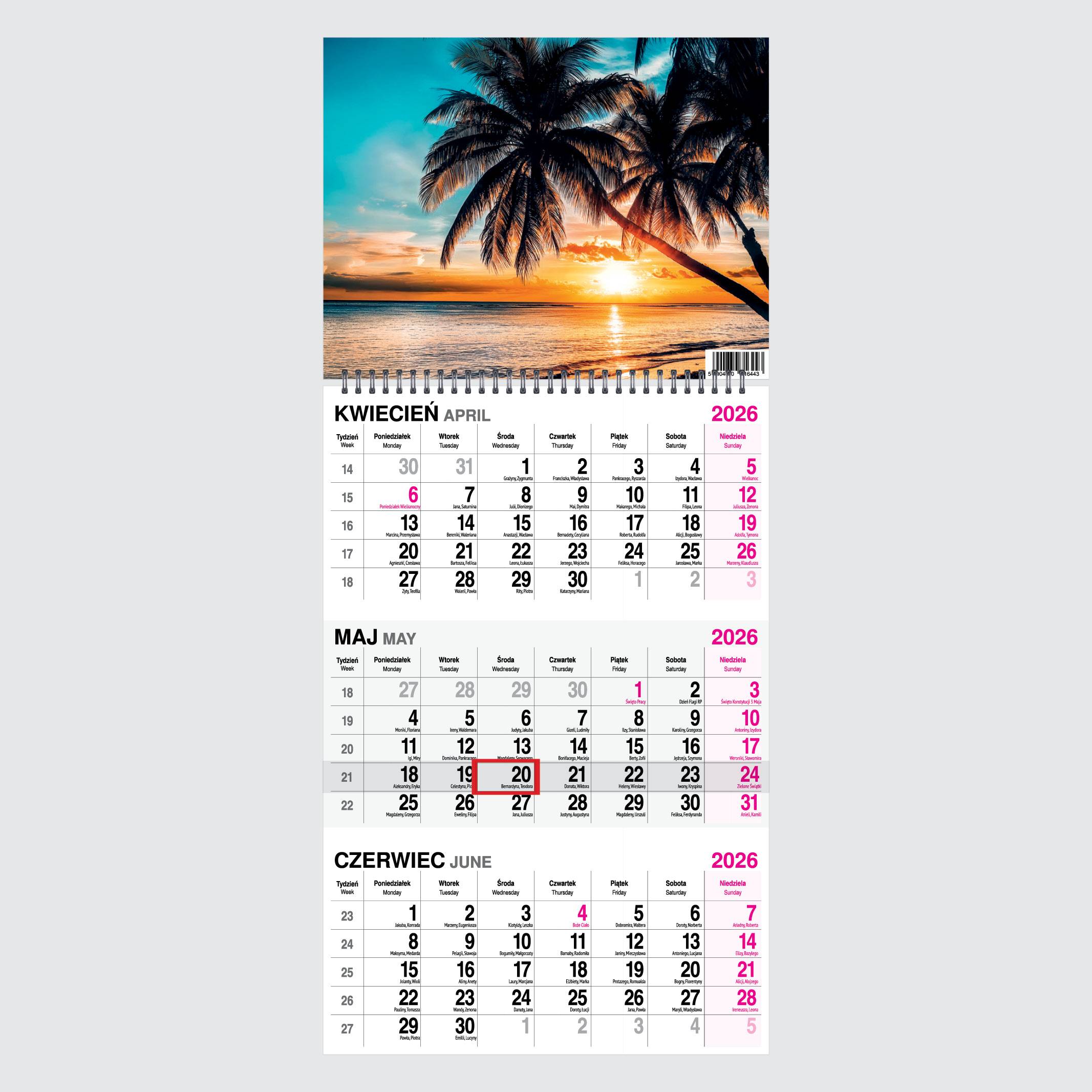 - Ilość stron: 12 - Oprawa: spirala - Układ kalendarium: 3 miesiące-1 kartka - Kalendarz posiada dziurkę umożliwiającą powieszenie - Zawiera czytelne kalendarium z imieninami i Świetami w języku polskim - Posiada okienko przesuwne