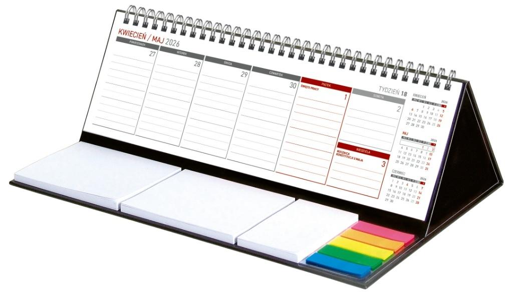 Opis produktuZasady bezpieczeństwaWygodny kalendarz stojący na biurko z przejrzystym kalendarium w układzie tygodniowym z miejscem do notowania. Poręczne samoprzylepne karteczki. Kalendarium na spirali. W kalendarzu zaznaczone święta. Na tylnej części podstawki kalendarza istnieje możliwość naniesienia reklamy na obszarze o wymiarach 305 x 100 mm w formie nadruku lub naklejki. Od 100 szt. istnieje możliwość wykonania indywidualnej podstawki oraz kalendarium full kolor.