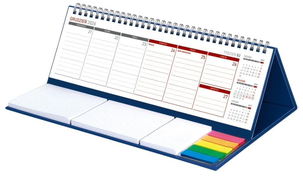 Opis produktuZasady bezpieczeństwaWygodny kalendarz stojący na biurko z przejrzystym kalendarium w układzie tygodniowym z miejscem do notowania. Poręczne samoprzylepne karteczki. Kalendarium na spirali. W kalendarzu zaznaczone święta. Na tylnej części podstawki kalendarza istnieje możliwość naniesienia reklamy na obszarze o wymiarach 305 x 100 mm w formie nadruku lub naklejki. Od 100 szt. istnieje możliwość wykonania indywidualnej podstawki oraz kalendarium full kolor.