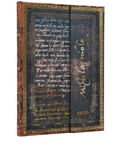Opis produktuZasady bezpieczeństwaKalendarz ekskluzywnej marki Paperblanks, Okładka z fragmentem listu napisanego przez Michała Anioła, jednego z najważniejszych twórców włoskiego renesansu, Format Midi typu Vertical - cały tydzień rozplanowany jest na 2 stronach z podziałką godzinową, Oprawa twarda, Kalendarium w języku angielskim, W środku miejsce na notatki, roczny planer, oznaczone wybrane święta międzynarodowe, mini kalendarium, międzynarodowe numery telefonów, strefy czasowe, Kalendarz posiada 2 satynowe wstążki jako zakładki, Na końcu po wewnętrznej stronie okładki jest koperta na drobne notatki, wizytówki czy paragony oraz oraz mini skorowidz na adresy i telefony, Papier ekologiczny, bezkwasowy, gramatura 100, Zamknięcie na magnes, Wymiary 13 x 18 cm, 160 stron x