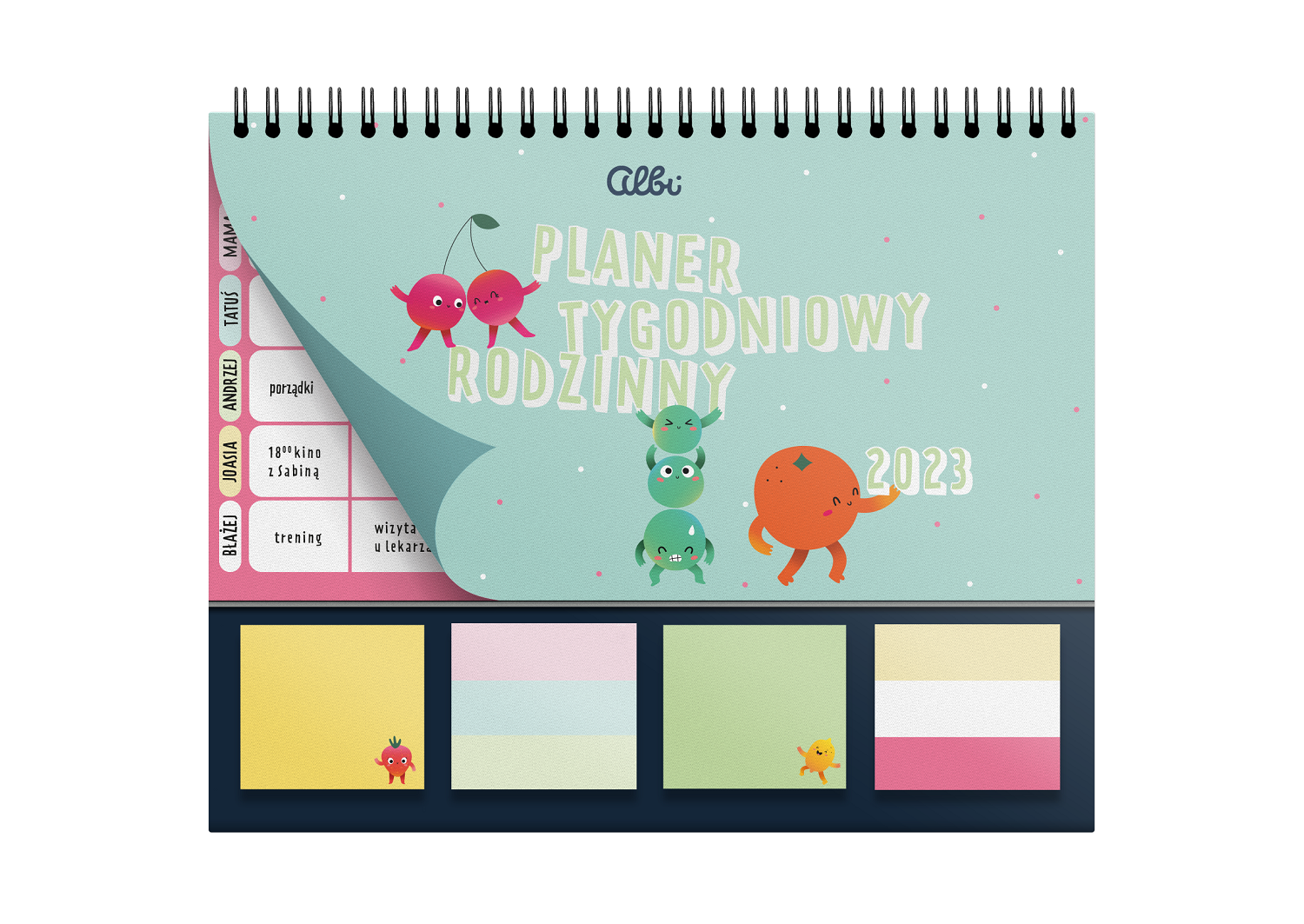 Opis produktuZasady bezpieczeństwaKalendarz rodzinny Mój szczęśliwy rok, stojący, z karteczkami samoprzylepnymi, motyw: miętowy.