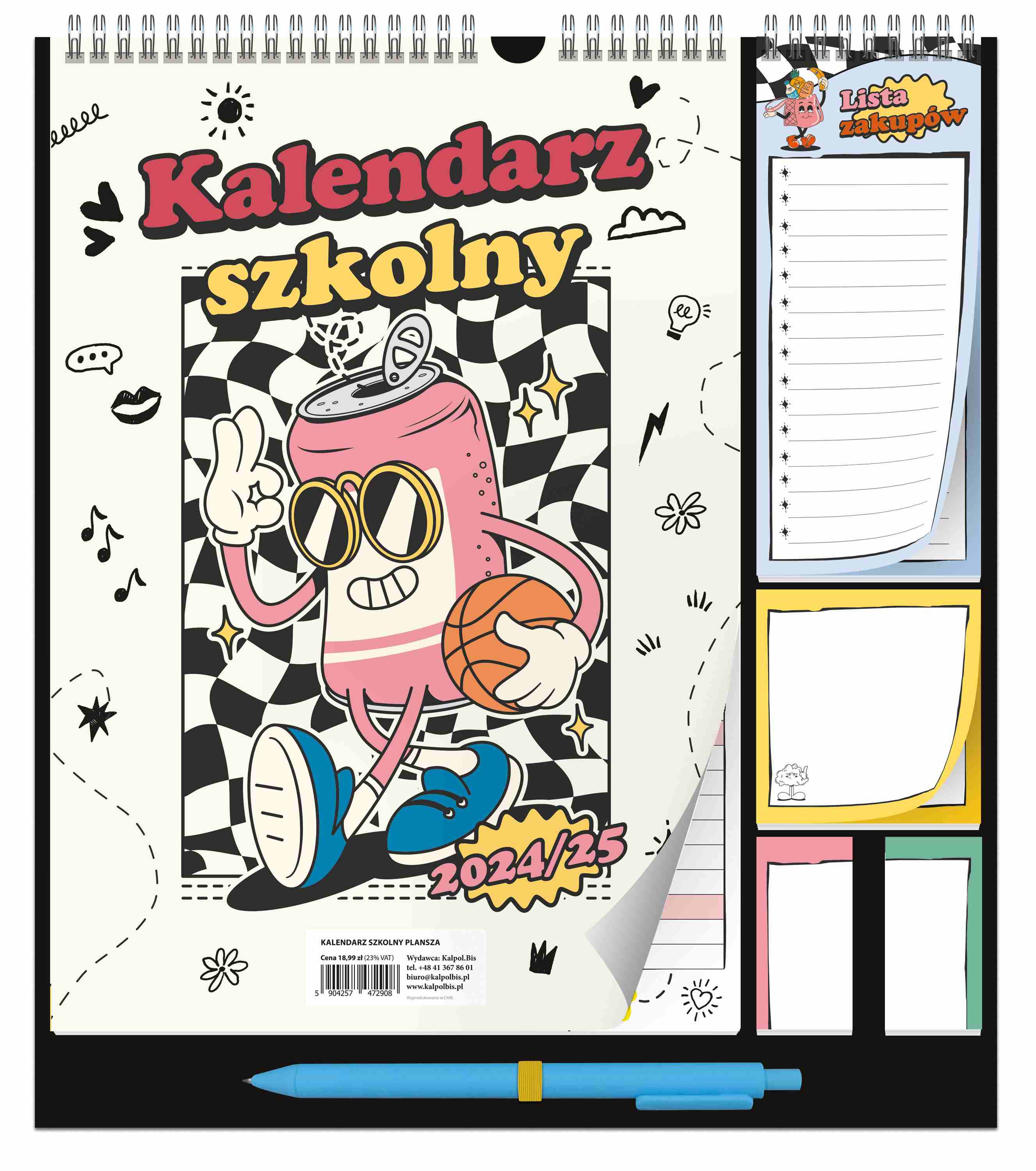 Opis produktuZasady bezpieczeństwa"układ kalendarium miesięczny, kalendarium od września do sierpnia, kalendarium z podziałem na członków rodziny, wielkość kalendarium: 215x310 mm, 12 kart 4+0 (zadruk jednostronny), 120 gsm, dodatkowo: karteczki z listą zakupów, karteczki samoprzylepne 30 szt., znaczniki samoprzylepne x2 30 szt., całość na plaszy ze spiralą + zawieszką." x