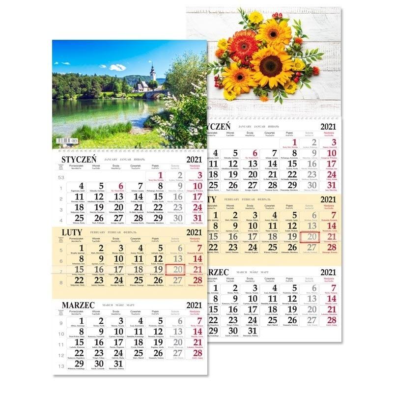 Kalendarium w układzie 3 miesiące na stronie, bieżący miesiąc wyróżniony kolorystycznie główka płaska - karton z okienkiem.