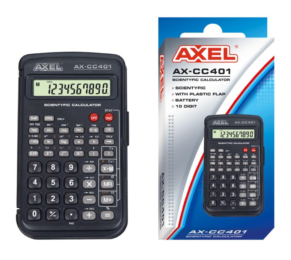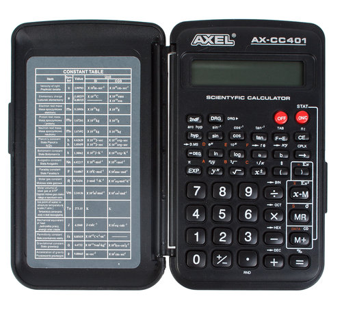 Kalkulator naukowy z plastikowym etui, na baterie. Posiada 10-cyfrowy wyświetlacz.