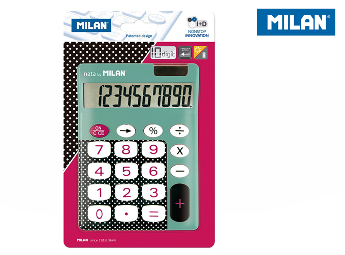 Kalkulator 10 pozycyjny z bardzo dużymi klawiszami, klawisz cofania ostatnio wpisanego znaku, plastikowe klawisze, podwójne zasilanie: bateria 1,5V oraz bateria słoneczna. Idealny dla osób starszych i słabowidzących. Fantazyjny design w kropki nawiązujący do kolekcji Dots & Buttons.
