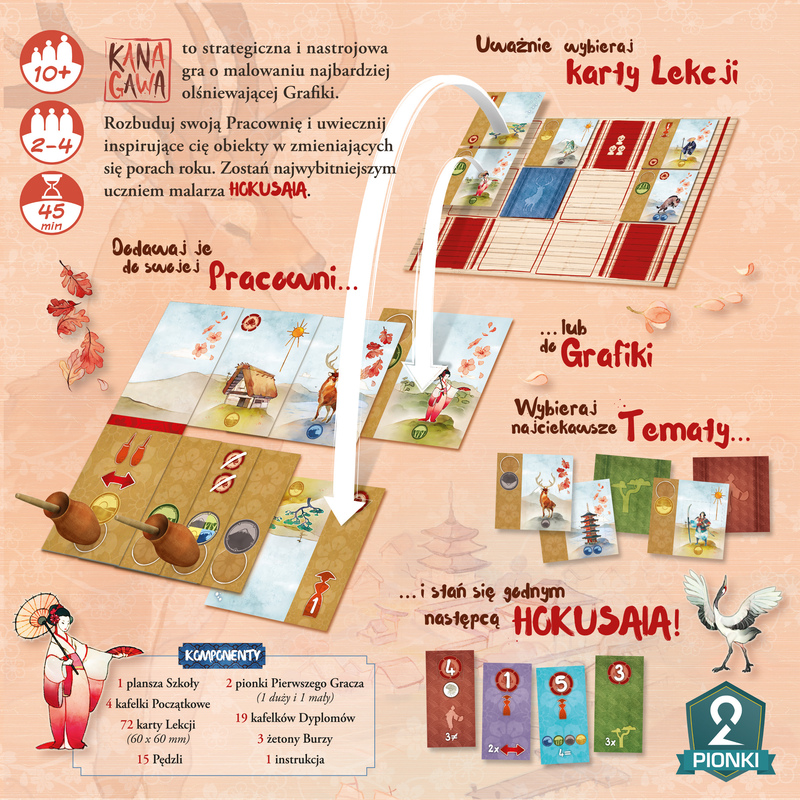 Opis produktuZasady bezpieczeństwaKanagawaW Kanagawie każdy z graczy wcieli się w artystę – i to nie byle jakiego, a ucznia samego mistrza Hokusaia. W czasie rozgrywki wszyscy uczniowie będą rywalizować o miano najlepszego malarza. Wybierz temat swoich obrazów i ruszaj tworzyć wiekopomne dzieła! Chwyć pędzel w dłoń, podążaj za naukami swojego nauczyciela, maluj, rozwijaj swoją technikę i studio – pokaż wszystkim, kto najlepiej operuje pędzlem! Wybierz swoją specjalizację (Drzewa, Zwierzęta, Postacie lub Budynki) i śledź uważnie zmiany pór roku – tylko dzięki temu uda ci się stworzyć najbardziej harmonijny obraz. To będzie dzieło twojego życia! Zagraj w najładniejszą grę planszową!W kolejnych turach gracz dobierają karty i decydują, w jaki sposób je wykorzystać. Każda karta ma dwie funkcje – może służyć do rozbudowania panoramy, ale także do nauki kunsztu malarskiego, dzięki czemu w następnych rundach będziesz mógł użyć bardziej zaawansowanych kart. Dbaj o to, by nie zabrakło ci pędzli! Za wyjątkowe osiągnięcia artystyczne gracze otrzymują dyplomy – pomagają one w rozgrywce i dają dodatkowe punkty zwycięstwa. Gra kończy się, gdy jeden z uczestników ułoży obraz z 11 kart lub kiedy wyczerpie się talia. Wtedy wszyscy gracze kończą swoje i tury podlicza się punkty. A w Kanagawie można je dostać za najróżniejsze osiągnięcia – musisz więc starannie dobrać taktykę i uważnie śledzić ruchy pozostałych uczestników. Kanagawa zachwyca urzekającym klimatem XIX-wiecznej Japonii. Przepiękna, dopracowana w najdrobniejszym szczególe gra wciągnie cię do urokliwego świata dalekowschodnich mistrzów pędzla. Gra