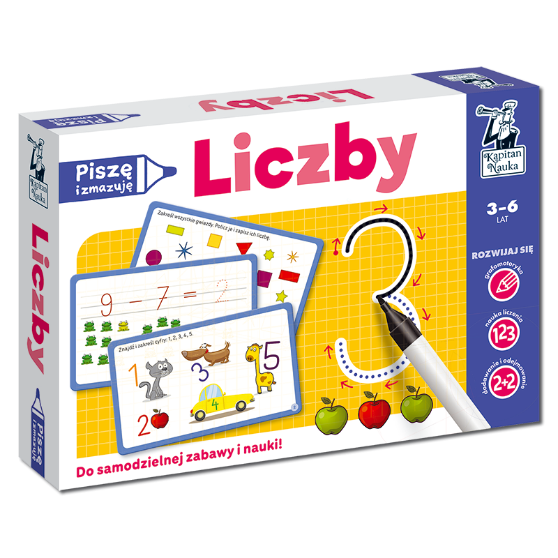 Piszę i zmazuję. Liczby (36 lat) to bogato ilustrowany zestaw zabaw (książka + karty ścieralne + flamaster) do nauki cyfr i liczb, który rozwija umiejętność liczenia oraz wspiera rozwój grafomotoryczny. Dzięki kolorowym łamigłówkom i zadaniom graficznym przedszkolaki uczą się poprawnego kierunku pisania liczb oraz doskonalą umiejętność przeliczania przedmiotów i rozwiązywania prostych działań arytmetycznych. Rozwijają przy tym również zdolność do koncentracji i myślenia logicznego.