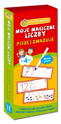 Moje Magiczne Liczby to:- nauka pisania liczb metodą po śladzie- przygotowanie do samodzielnego dodawania i odejmowania- trening rączki poprzez rysowanie szlaczków- zmywalne strony - możliwość wielokrotnego ćwiczenia pisowni- mazak ze ścierającą końcówką - GRATIS!Moje Magiczne Liczby to wyjątkowy zestaw dwustronnych, ścieralnych kart do nauki liczb i działań matematycznych dla najmłodszych. Dzięki kartom dzieci uczą się podstawowych liczb, uzupełniają szlaczki oraz ćwiczą dodawanie i odejmowanie. Pakiet przeznaczony jest dla dzieci powyżej 4 roku życia, które dopiero zaczynają swoją przygodę z liczeniem, ale może być także z powodzeniem wykorzystywany przez starsze dzieci.Kilkadziesiąt ścieralnych kart nadaje się do wielokrotnego użytku, co pozwala ćwiczyć liczby, szlaczki oraz działania tak często, aby dziecko mogło się ich bez trudu nauczyć. Na awersie karty znajduje się liczba oraz szlaczek do trenowania rączki. Na rewersie umieszczono przykładowe działanie oraz obrazki ułatwiające dziecku liczenie.Moje Magiczne Liczby to unikalne karty otwierające przed dzieckiem magiczny świat liczb i liczenia. Zabawa z pakietem to także ćwiczenie na koncentrację i spostrzegawczość. Dodatkowo karty zapewniają świetną zabawę. Doskonale nadają się do samodzielnej pracy w domu, czy pod okiem nauczyciela w przedszkolu lub szkole.