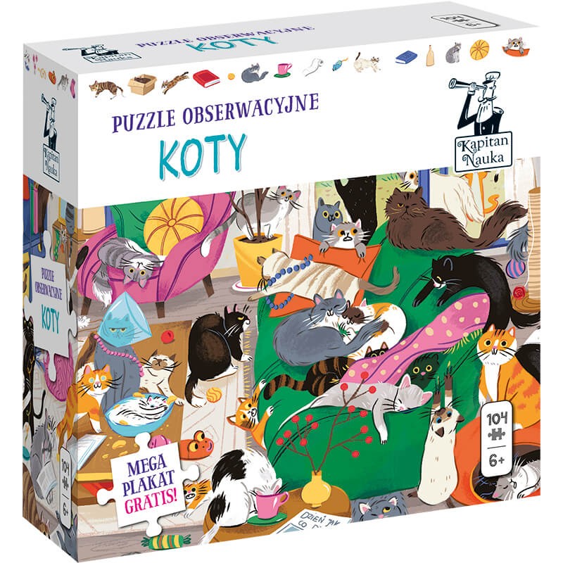 PUZZLE OBSERWACYJNE KOTY z serii Kapitan Nauka to zestaw 104 elementów dostosowanych do wieku i umiejętności dzieci od szóstego roku życia. Bajecznie kolorowe ilustracje autorstwa MAŁGORZATY DETNER są pełne szczegółów, które mogą być inspiracją i pretekstem do opowiadania niesamowitych historii.