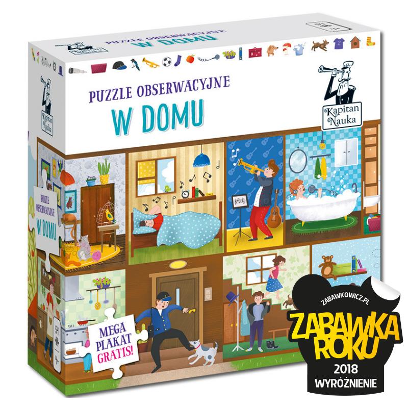 Puzzle obserwacyjne. W domu – to zestaw 54 dużych elementów do układania dla dzieci od 4 lat i fantastyczny sposób na pobudzanie wyobraźni, rozwijanie wrażliwości estetycznej i kształtowanie umiejętności wypowiadania się na temat oglądanych ilustracji! Ramka z elementami do wyszukania na ilustracji doskonale trenuje spostrzegawczość i koncentrację dziecka.