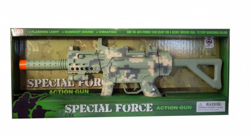 Karabin z dźwiękiem. Zasilany dwoma bateriami AA, nie dołaczone do zabawki.
