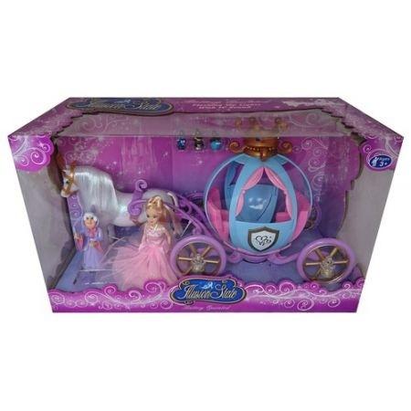 W skład zestawu wchodzi kareta z podświetlanymi kołami, koń, lalka i cztery figurki.