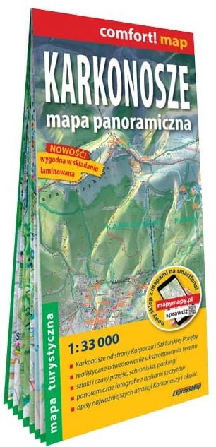 Karkonosze. Mapa panoramiczna to wyjątkowa publikacja ukazująca najwyższe pasmo Sudetów w orientacji południowej, czyli widziane od strony Karpacza i Szklarskiej Poręby. Takie rozwiązanie znacznie ułatwia korzystanie z mapy wszystkim wyruszającym w góry z Kotliny Jeleniogórskiej. Kolejnym atutem mapy jest zastosowanie rzutu panoramicznego do prezentacji ukształtowania terenu, co w połączeniu z cieniowaniem dało niezwykle realistyczny efekt przestrzenny przypominający widok na góry z lotu ptaka.