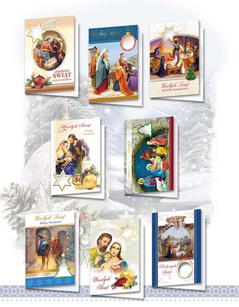 Karnet B6 ząbkowany na zewnątrz z kolorowym rewersem i życzeniami. Do karnetu dołączony jest opłatek wklejony wewnątrz w małej kopercie. Pakowany do folii wraz z kopertą w miksie seriami po 10 sztuk.