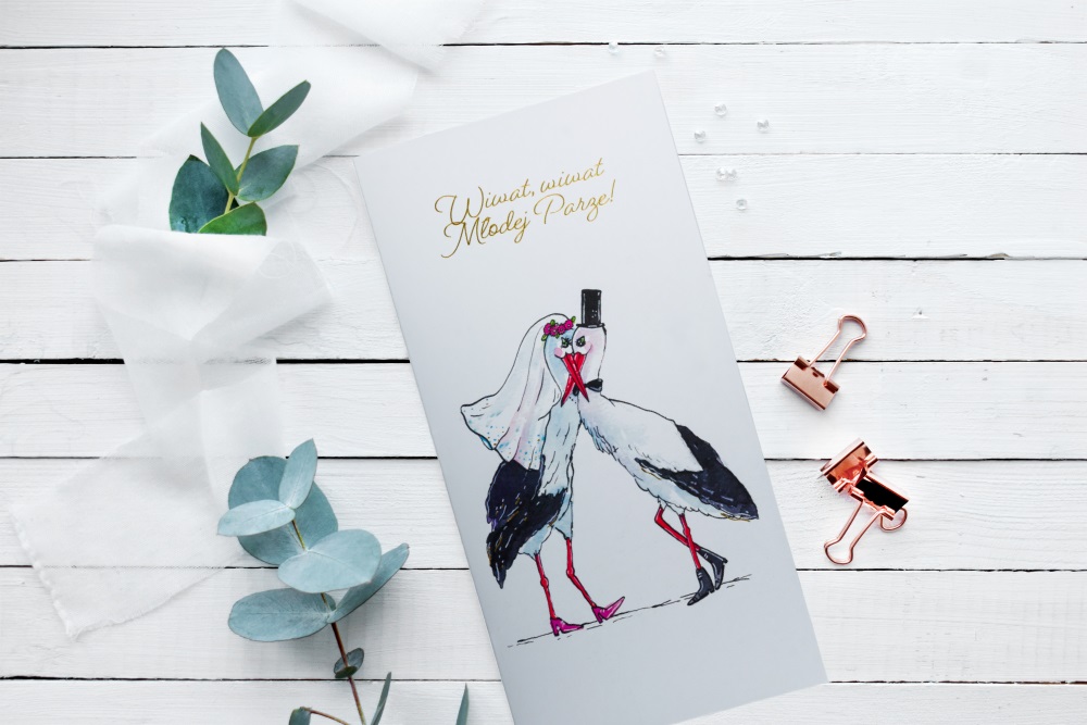 Karnet w formacie DL. Karnet złocony w zestawie z kopertą.